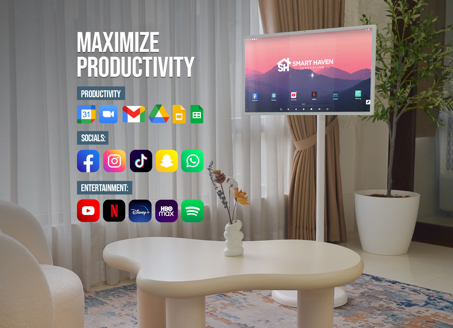 Boost your efficiency with Smart Haven's Smart Mobile TV. Access essential productivity apps and tools, all in one versatile device, designed to enhance your work and leisure activities.